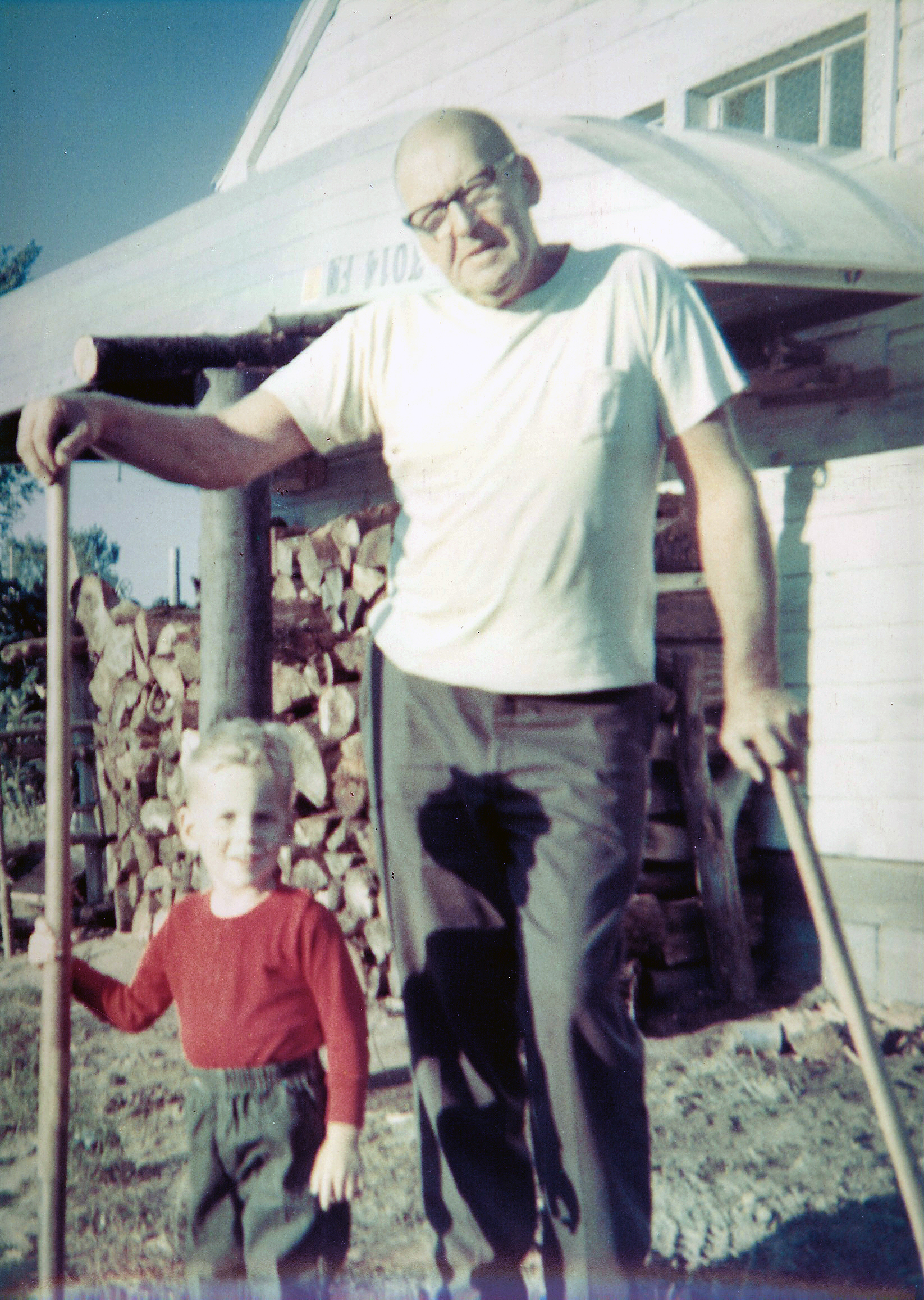 Dad and I outside the west end of the Shop. An ample supply of firewood was protected by our fishing boat.