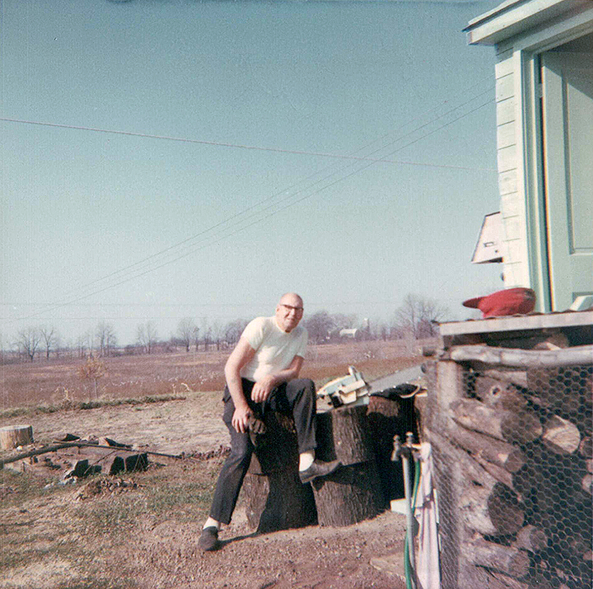 Dad taking a break from sawing firewood, with some of the Back 40 in view.
